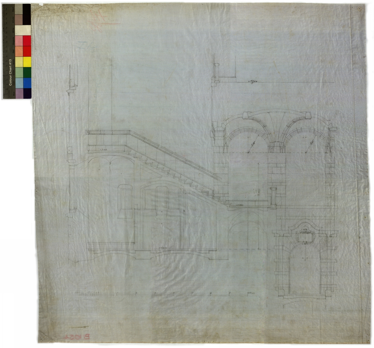 Ritning på väv över Nordiska museets huvudbyggnad. Underlag till No 105. Vestibulen.Trappa mellan tredje viloplanet och första galleriet sedd mot vestibulen. Sektion. Vestibulen, stora trappan. 72,5x71 cm. Blyerts. Linjalritning. Osignerad.