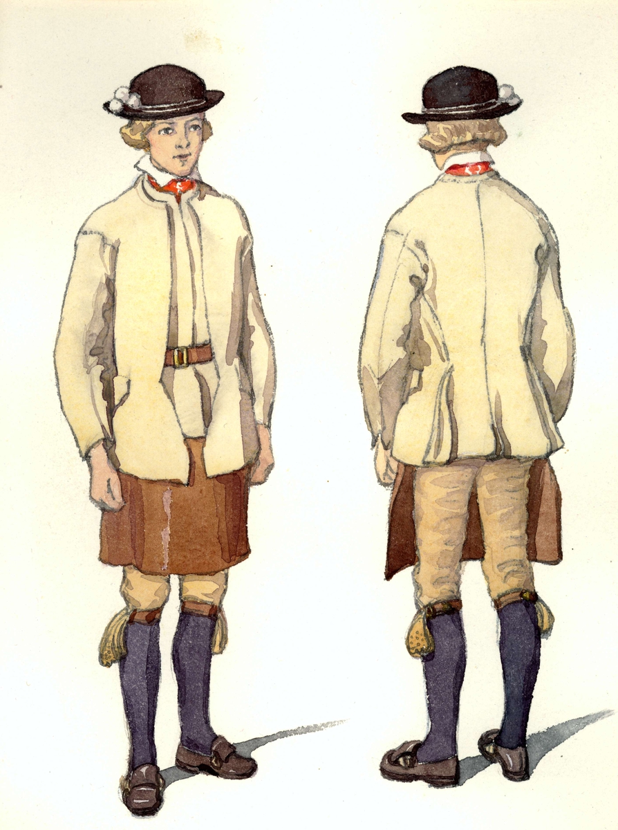 Helgdagsdräkt; man, Orsa socken, Dalarna. Akvarell av Emelie von