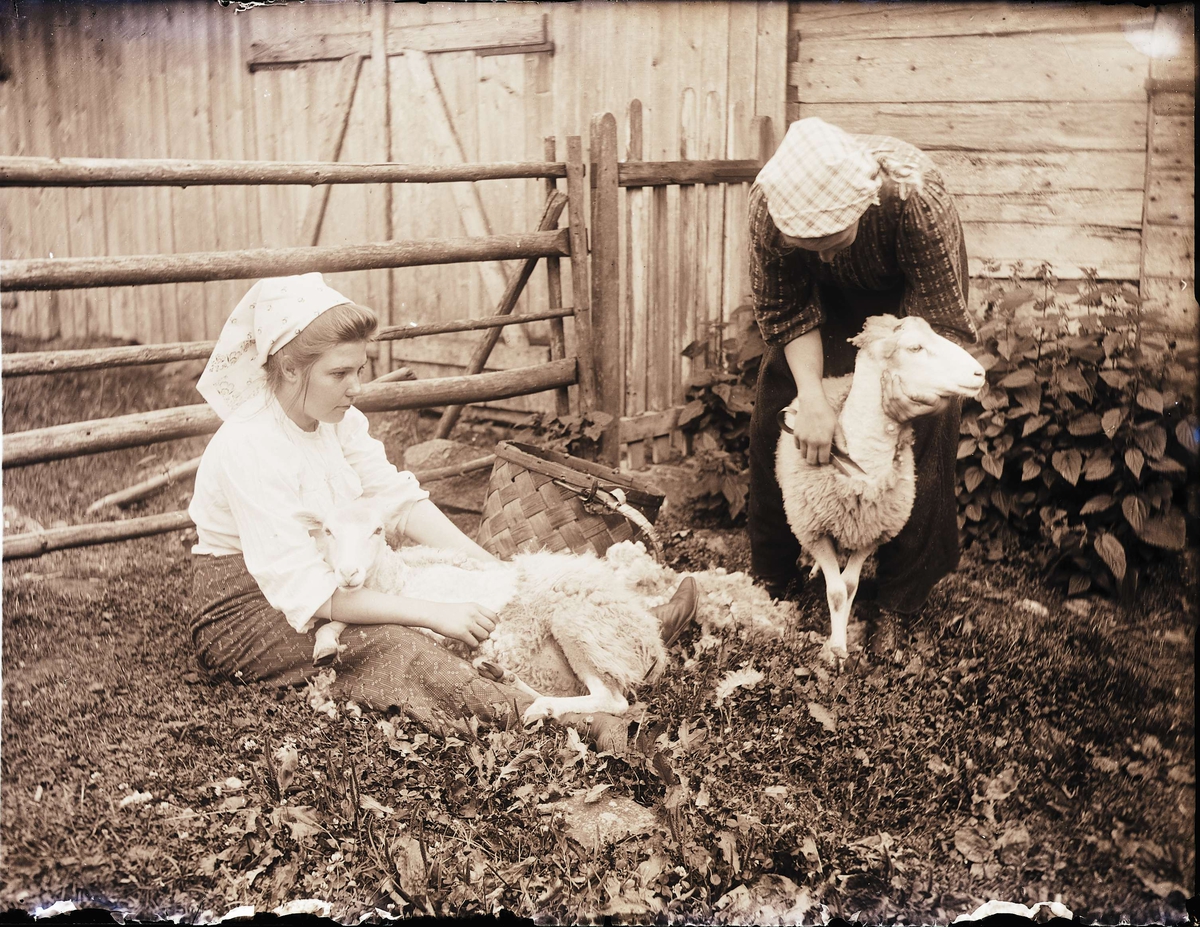 Två kvinnor klipper får.