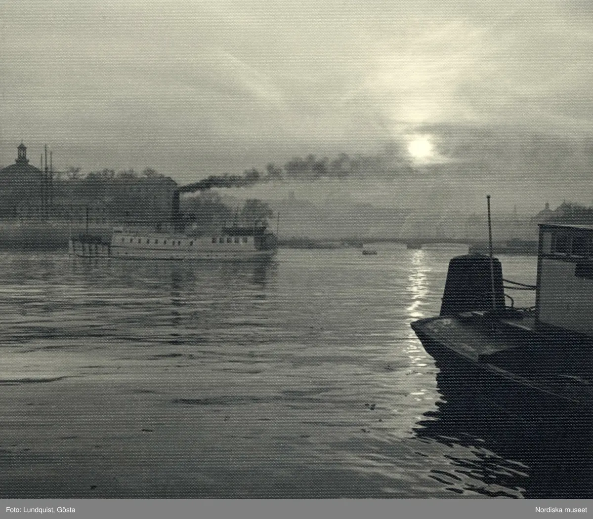 Båtar, varav en ångbåt, på Nybroviken i Stockholm en molnig dag. I bakgrunden Skeppsholmen.