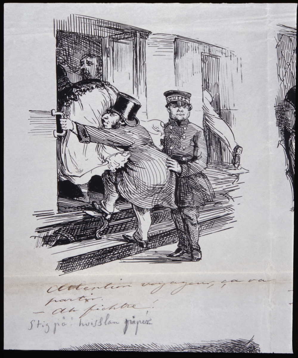 Ombordstigning på tåg. "Stig på! hvisslan piper". Tusch av Fritz von Dardel