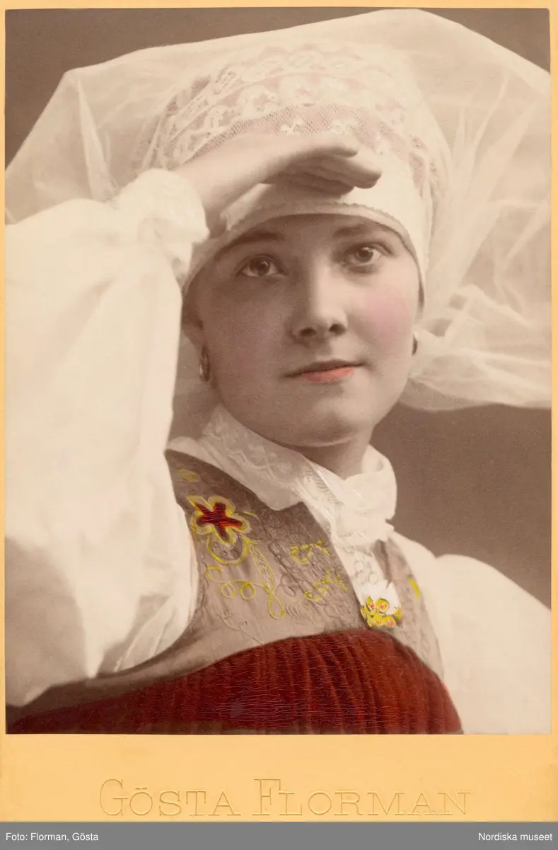 Kolorerat porträttfotografi av spejande kvinna klädd i högtidsdräkt från Österåker, Södermanland.