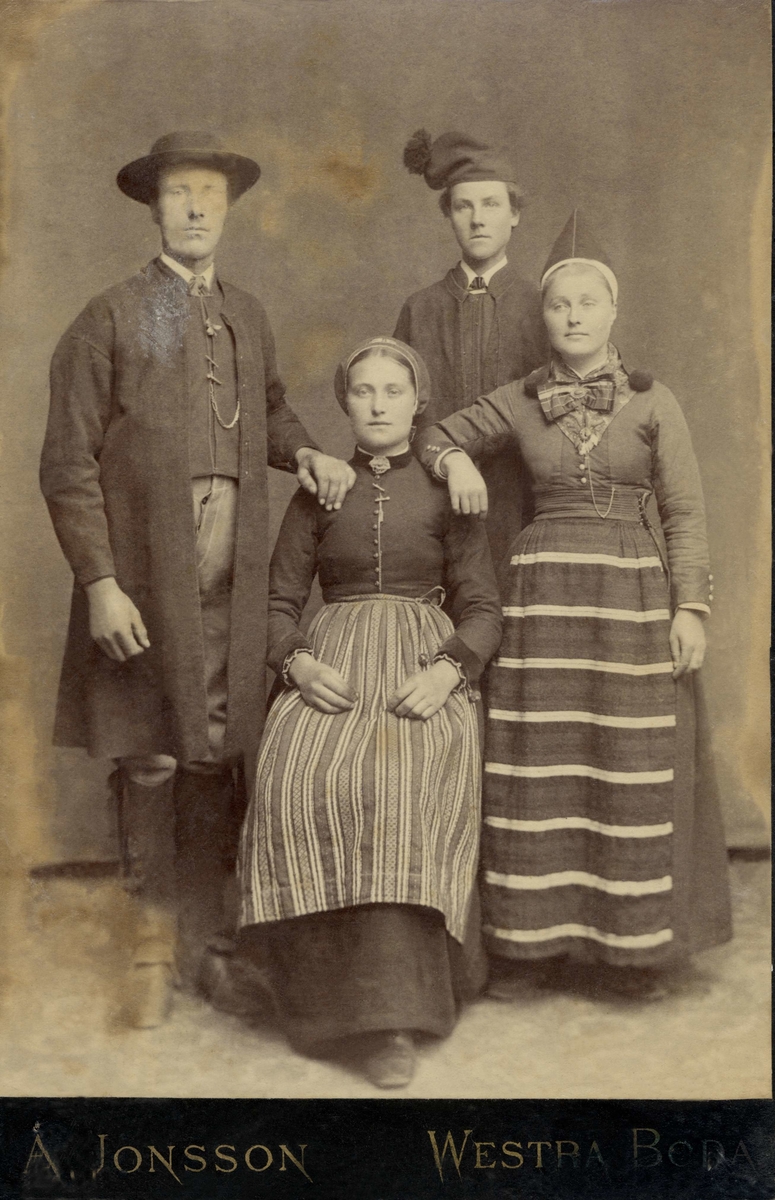 En familj poserar klädda i dräkter från Rättvik, Dalarna.