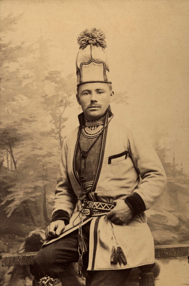 Ateljéporträtt. Man iklädd samisk dräkt.