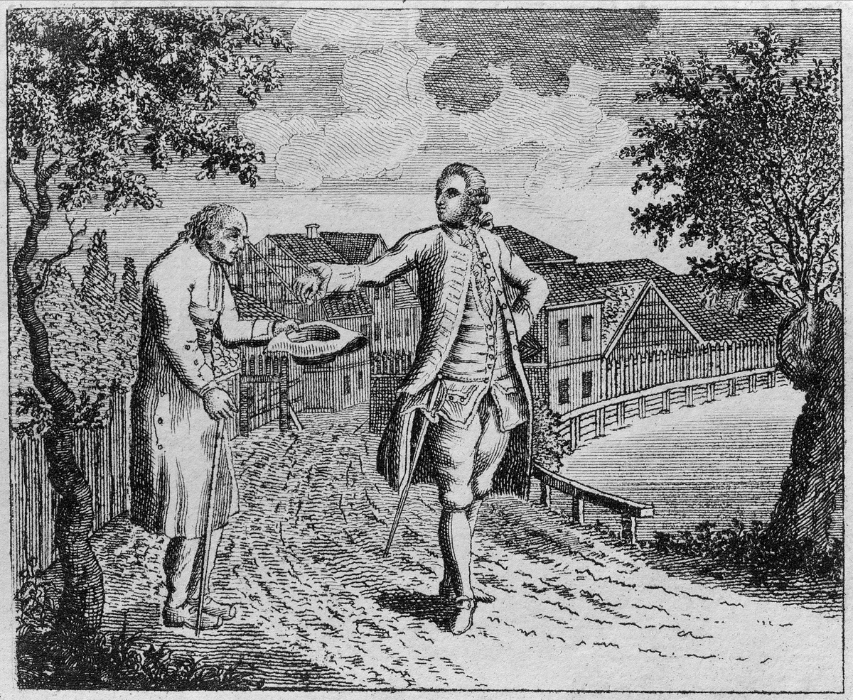 En herre ger allmosa åt en tiggare. Kopparstick av okänd konstnär, 1700-tal.