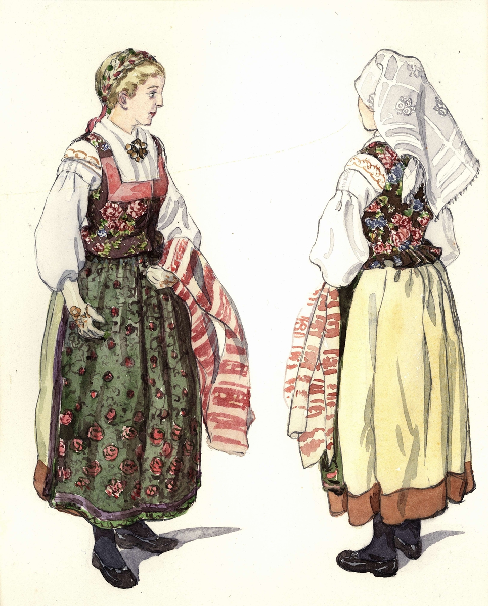 Högtidsdräkt för kvinnor, Öland. Akvarell av Emelie von Walterstorff.