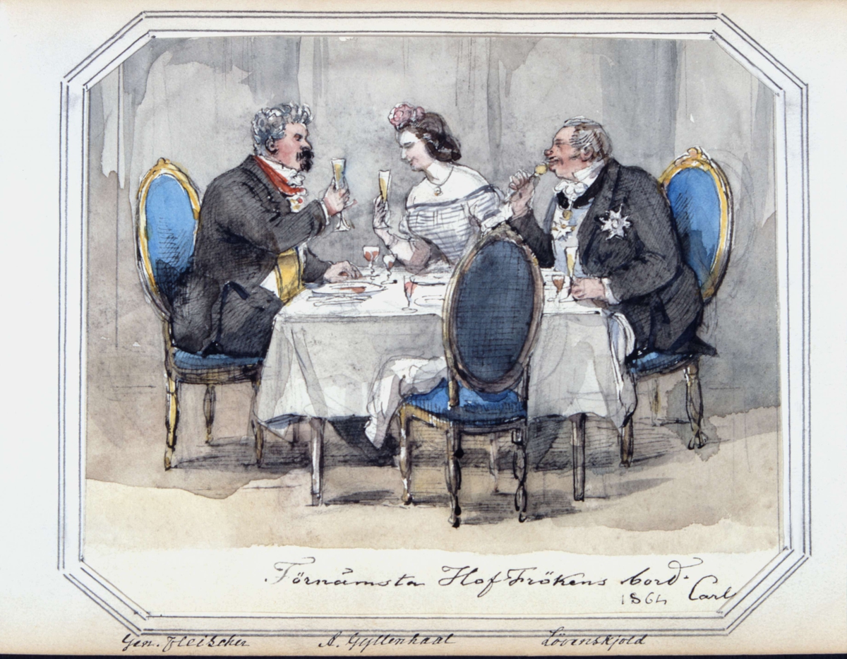 "Förnämsta Hof-Frökens bord". General Fleischer, Aurora Gyllenhaal, Lövenskjöld. Akvarell av Fritz von Dardel, 1864.