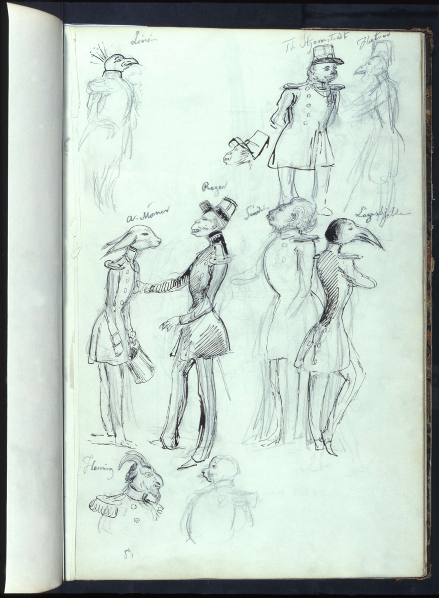 Människokroppar med djurhuvuden. A. Mörner, Sandels, Lagerbjelke m fl. Karikatyrteckning av Fritz von Dardel.
