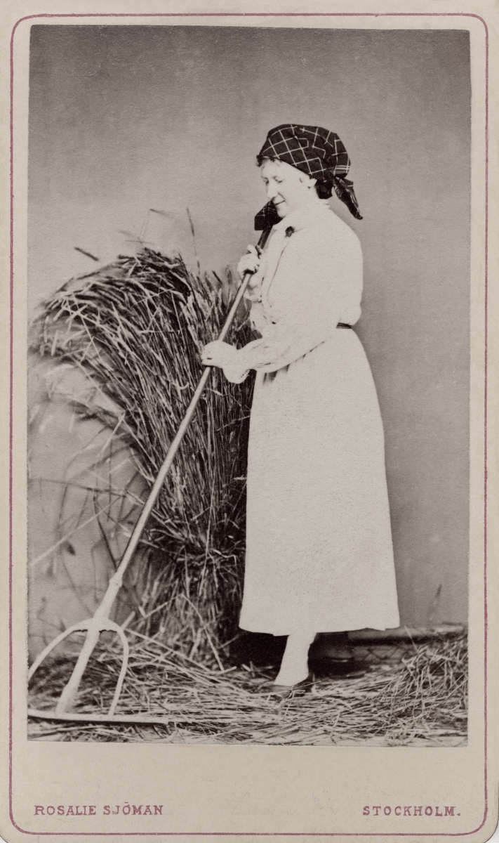 Porträttfoto i ateljé, en kvinna som håller på att räfsa.