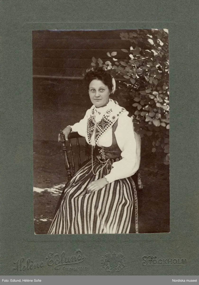 En kvinna i folkdräkt sitter på en stol, ute vid en husvägg