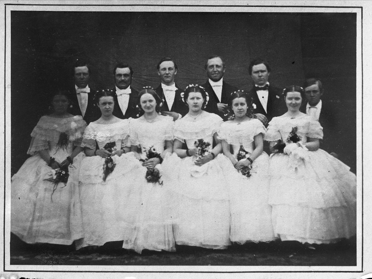 Bröllop, brudpar. Brukspatron E.J. Jansson och Mathilda Carlssons bröllop den 6 september 1859. Bruden nr 2 fr.v. i nedre raden. Grythyttan, Västmanland.