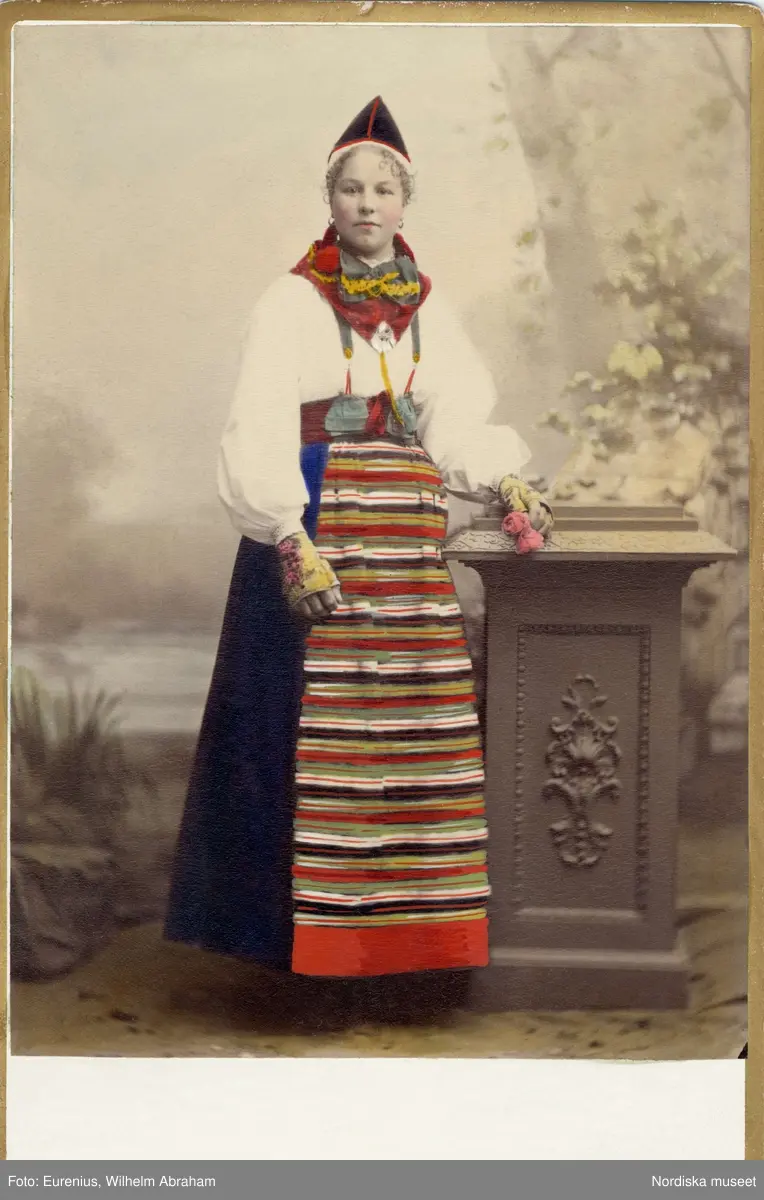 Ateljéporträtt av Vass Anna, klädd i folkdräkt från Rättvik i Dalarna. Kolorerat fotografi.
