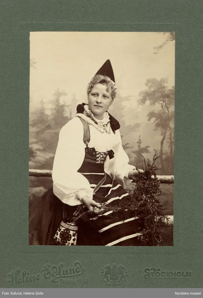 En kvinna poserar i folkdräkt från Rättviks socken i dalarna.