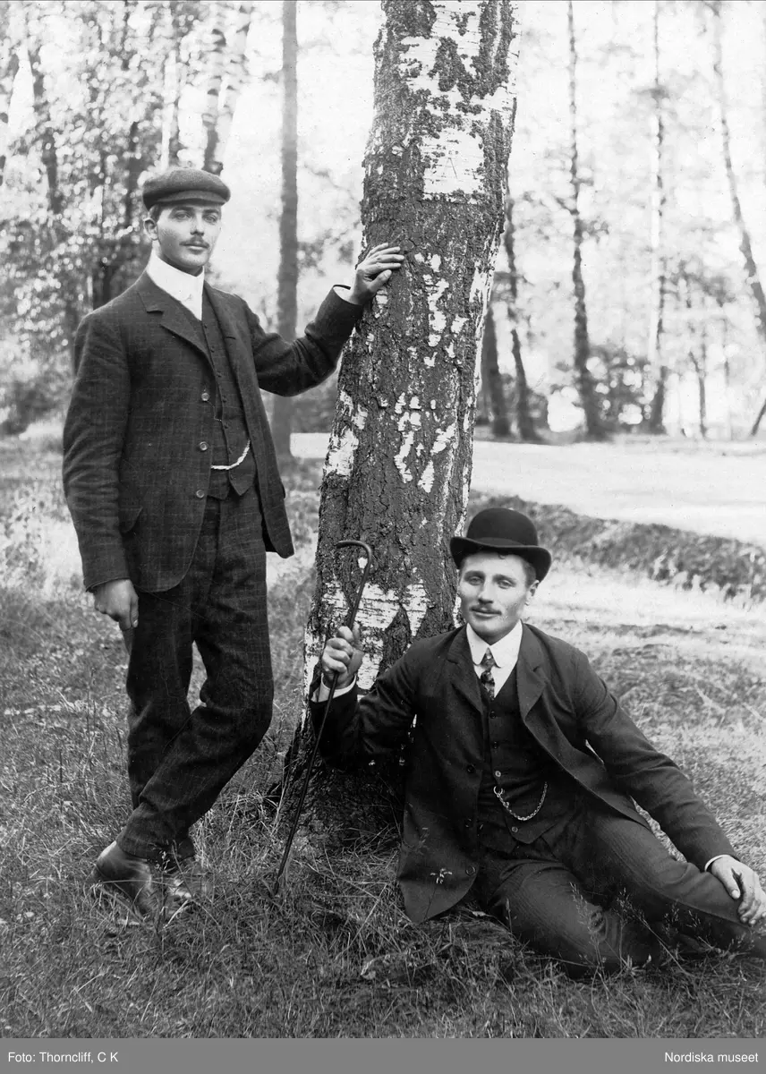 Två unga män i utomhusmiljö, den ene sittande med promenadkäpp och plommonstop, den andre med keps lutandes mot en björk.