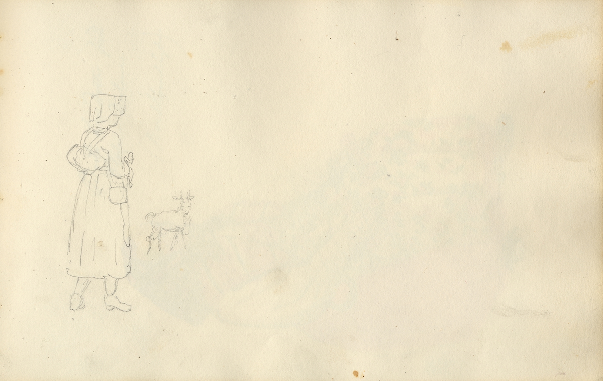 Blyertsskiss. Flicka som går i vall med en get. Ur Skissbok av A. J.G. Virgin
