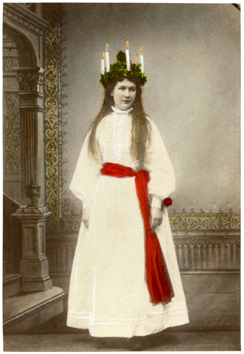 Ateljéporträtt, kolorerat, föreställande Kröök Karin Olsdotter från Leksand i Dalarna som Lucia. Hon bär långt, vitt, linne, rött band i midjan och en klädd krona med ljus. Skansens Lucia omkring 1898.