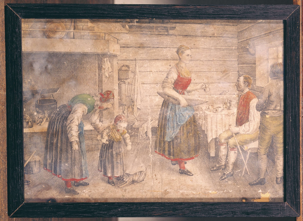 Målning, allmogeinteriör. En kvinna och en flicka leker med en katt. En kvinna serverar en man som sitter vid ett bord med vit duk.