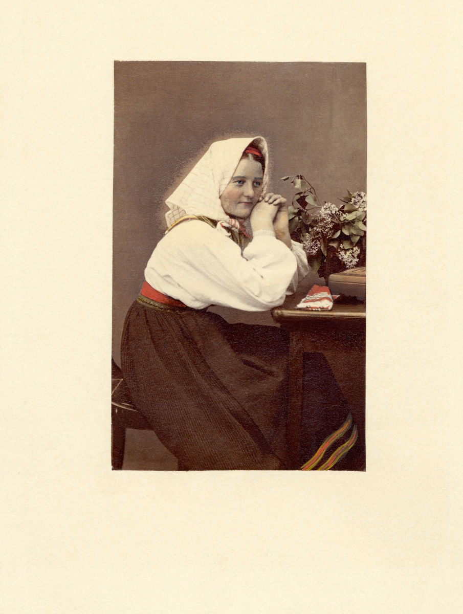 Porträtt av sittande ung flicka i folkdräkt från Dalarna, möjligen Venjan. På bordet en bukett syrener. Handkolorerat fotografi.