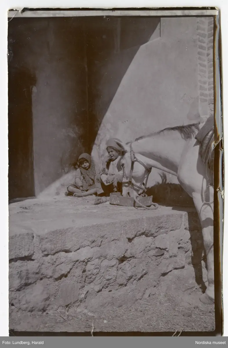 Persien. Två barn bredvid en häst som äter ur ett tråg.
