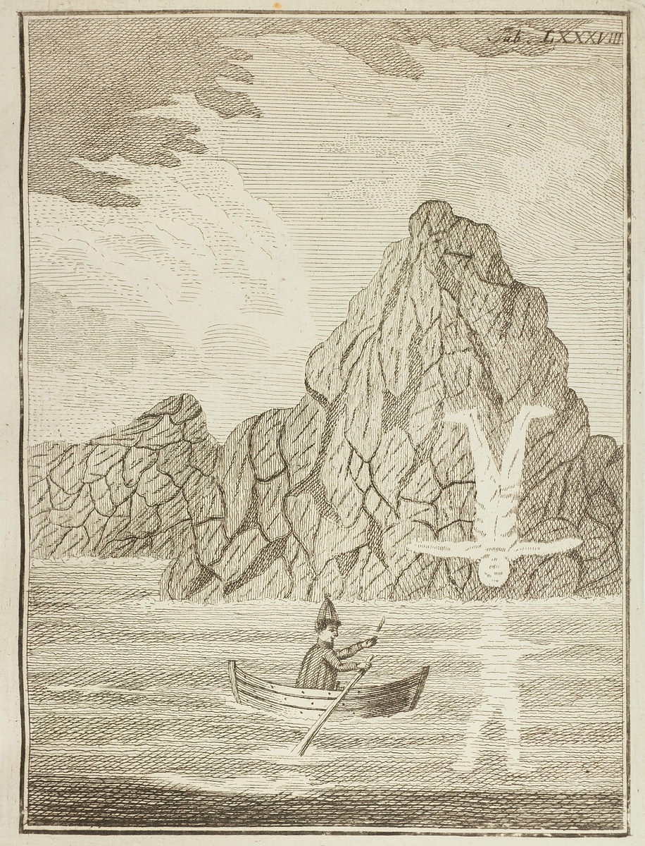 Stick ur Knud Leems bok: Beskrivelse over Finmarkens lapper, deres tungemaal, levemaade og forrige afgudsdyrkelse med J.E. Gunneri Anmaerkninger. Tab. LXXXVIII. På en klippvägg syns en figur av en människa med utsträckta armar som hänger upp och ned. Tobak offrades till bilden i berget då man passerade i båt för att få tur.