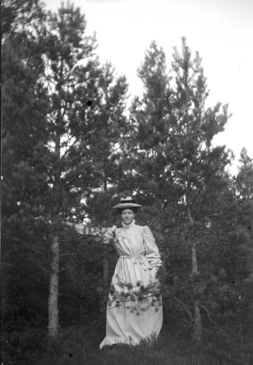 Helporträtt av en kvinna i vit klänning och hatt bland tallar.