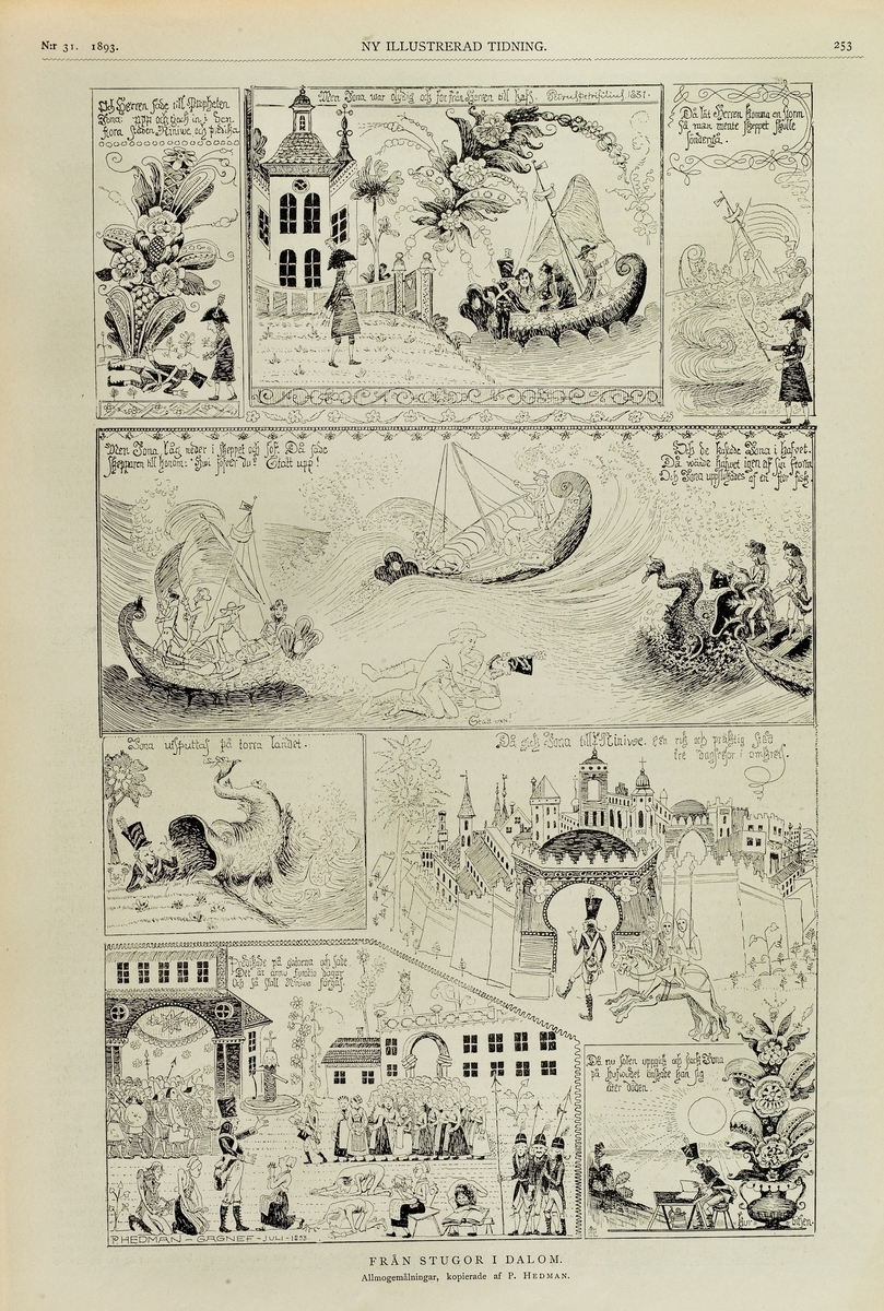 Från stugor i Dalom. Allmogemålning kopierade av P. Hedman. Ur Ny Illustrerad Tidning 1893, nr 31 sid 253.