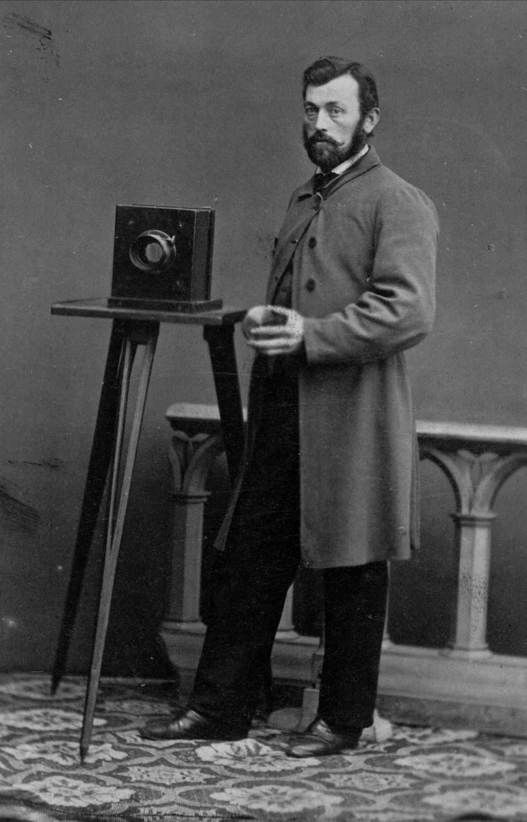 Fotograf med lådkamera på stativ. Bilden enligt uppgift tagen i Eslöv.