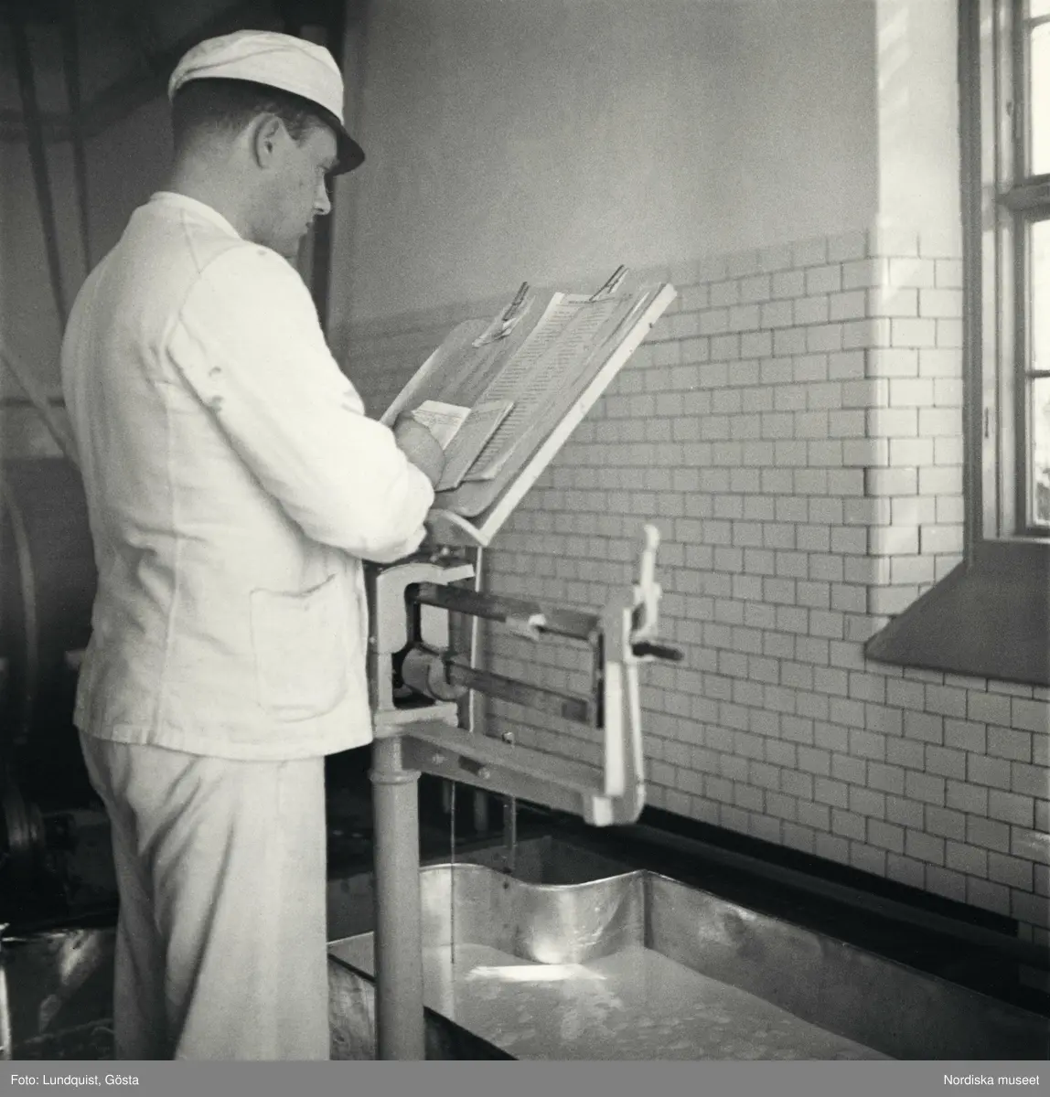 Mjölken väges. En man i arbete vid mejeriet i Normlösa, Östergötland.