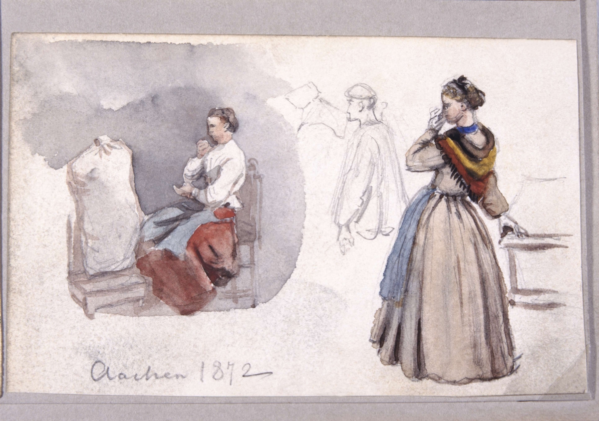 Aachen 1872. Sittande och stående kvinna. Akvarellerad skiss av Fritz von Dardel