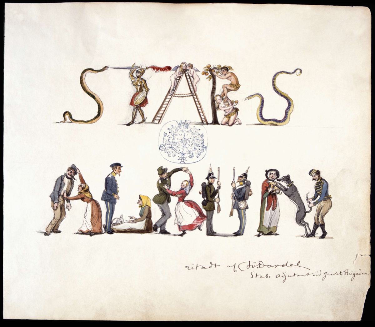 "Stabsalbum". Ritadt af F. v. Dardel, stabsadjutant vid gardesbrigaden. Omslagssida. Akvarell av Fritz von Dardel.