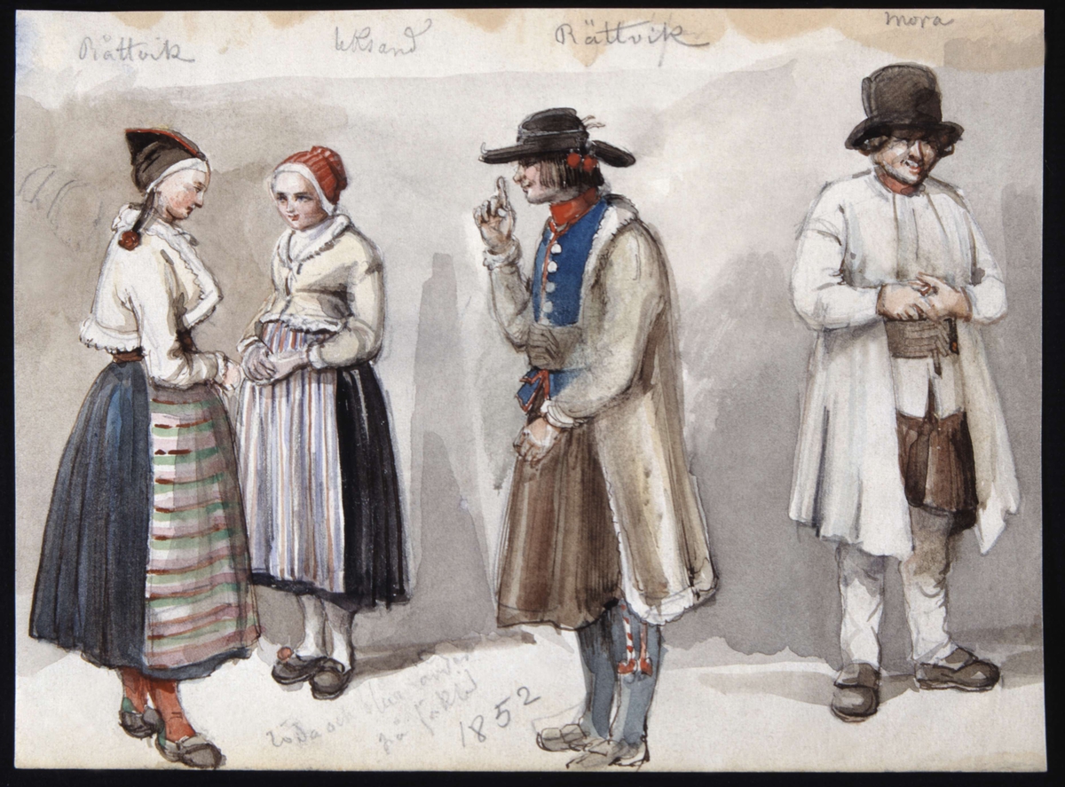 Två kvinnor och två män i allmogedräkter från Rättvik, Leksand och Mora. Akvarell av Fritz von Dardel, 1852