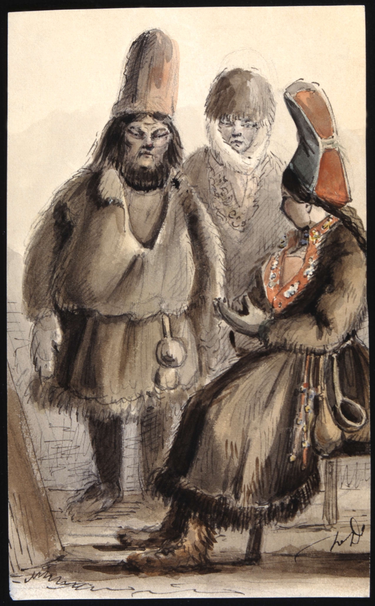 Två män och en kvinna i samisk vinterdräkt. Akvarell av Fritz von Dardel