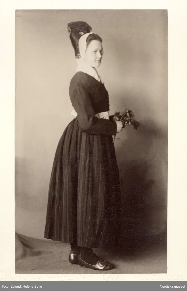 En kvinna poserar i folkdräkt.
