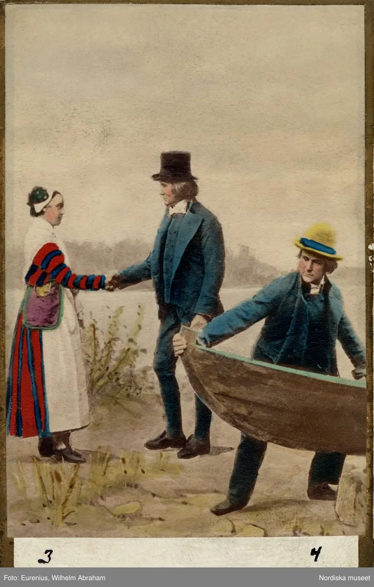 Titel: Ett färglagt foto på en kvinna och två män i folkdräkt