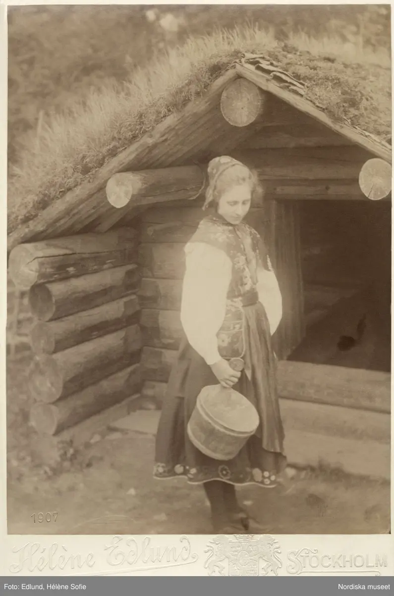 En ung kvinna står utanför ett timrat hus, med en träbytta i handen