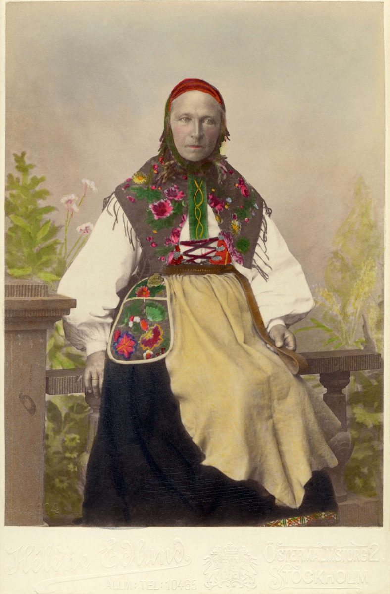"Floda utställningen 1897." En kvinna poserar i en folkdräkt med skinnförkläde