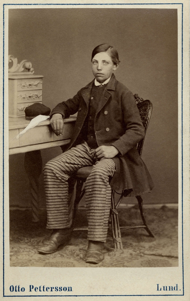 En ung man sitter på en stol, lutande armen mot ett skrivbord. Från Löddeköpinge, Harjagers härad i Skåne. Inv.nr. 18518R.