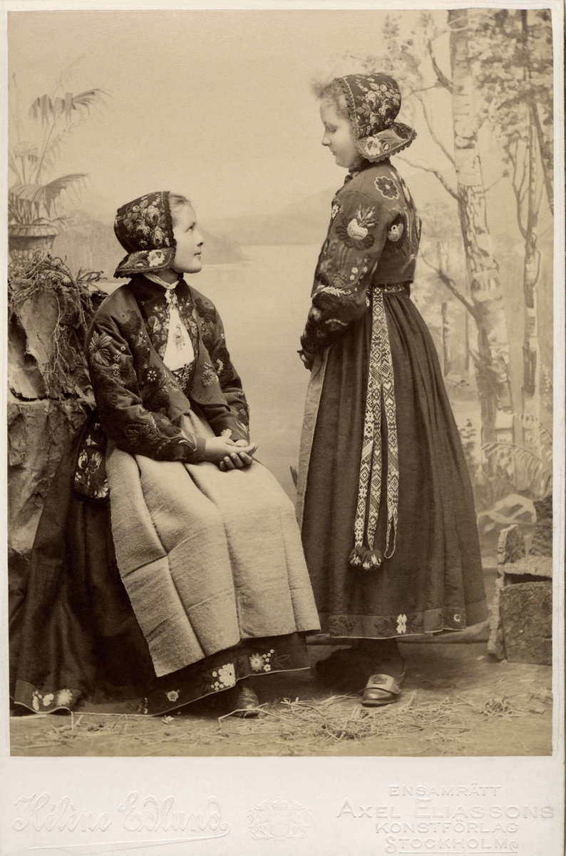 Två unga flickor poserar i dräkter från Dala-Floda med blommiga jackor och hättor.
