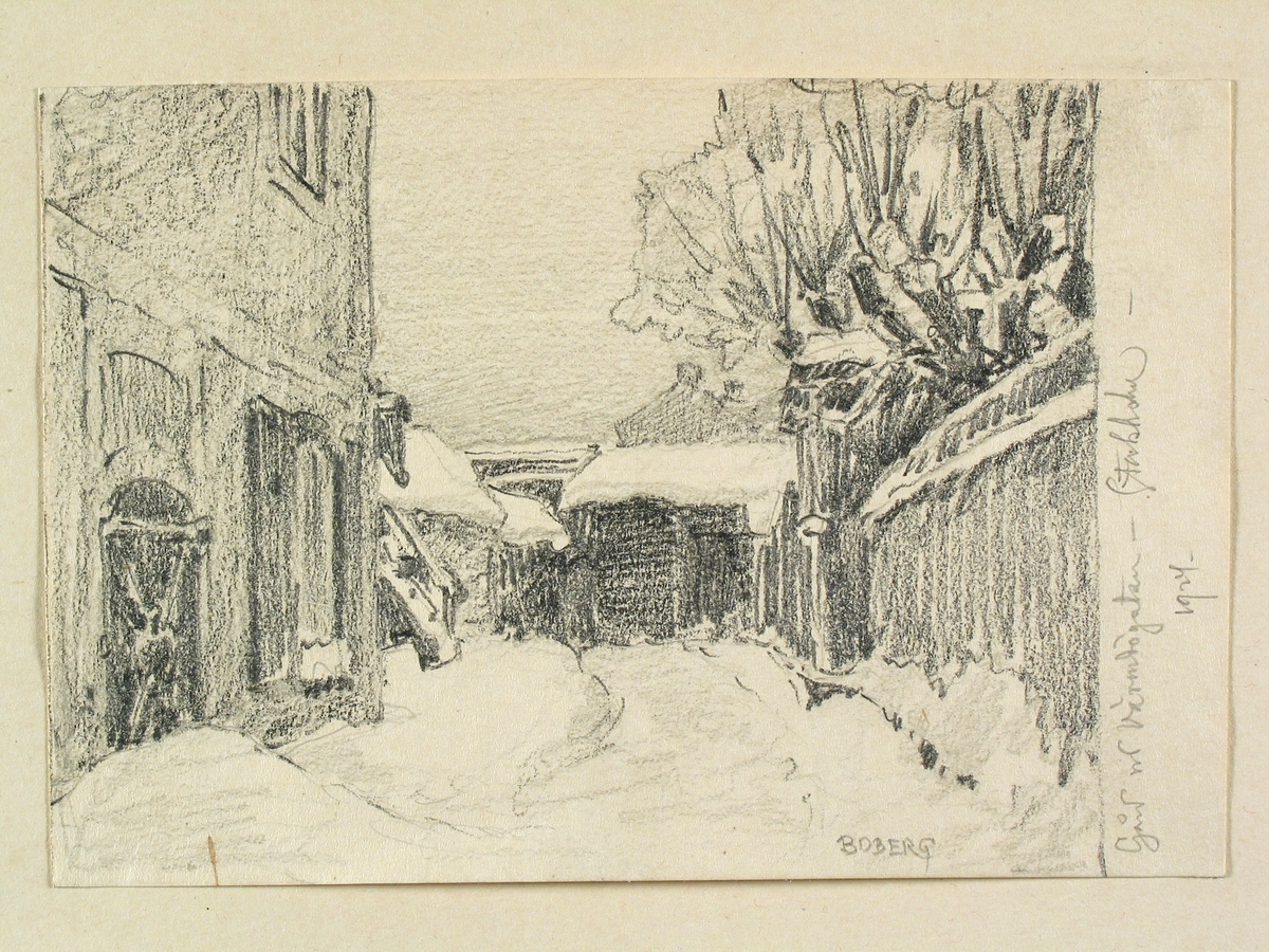 Stockholm, Södermalm, Kv. Värmdögatan (Nuvarande Malmgårdsvägen år 2017)Gårdsinteriör vintertid . Teckning av Ferdinand Boberg.