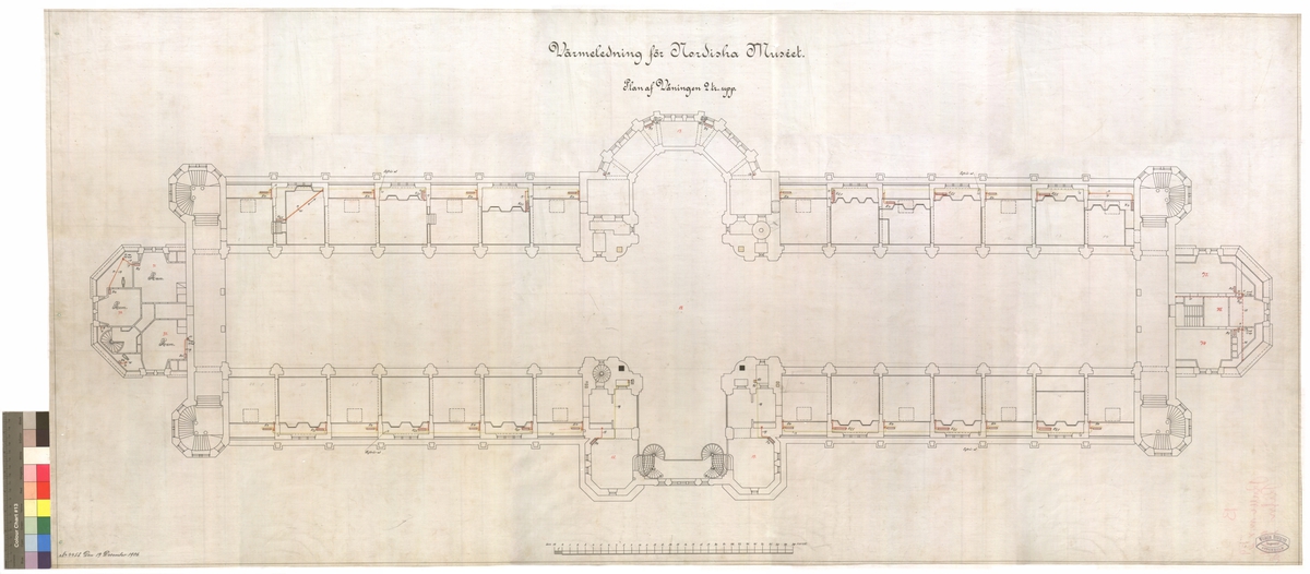 Värmeledning för Nordiska museet. Plan över våningen 2 trappor upp. Installationsritningitning, värmeledning, galleri II. Tusch, rött, gult. Linjalritning. 72, 5x162 cm. "No 4458. Den 19 December 1906". Stämplad "Wilhelm Dahlgren Ingeniör Stockholm"