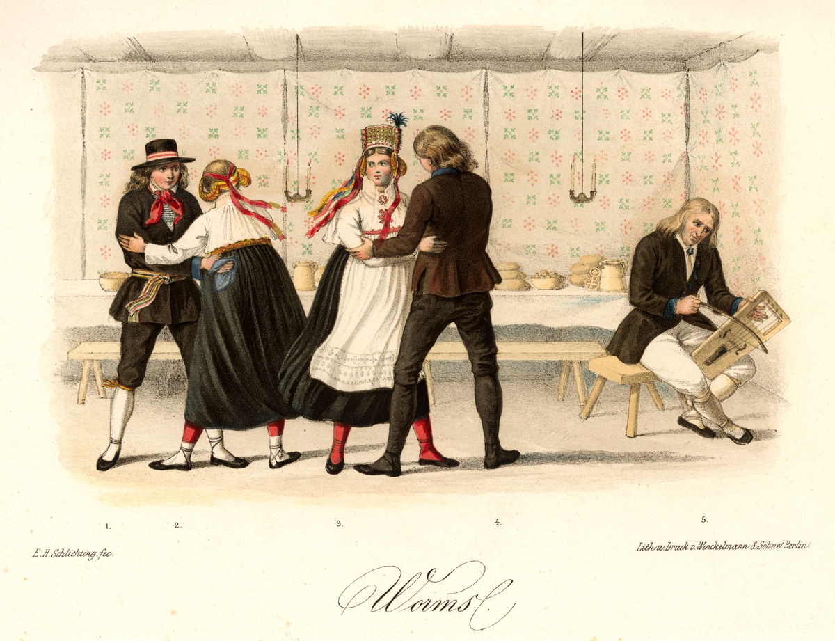 Allmoge från Ormsö, Estland. Interiör med två dansande par. "E. H. Schlichting. fec. Worms. Lith. u. Druck v. Winckelmann & Söhne. Berlin"