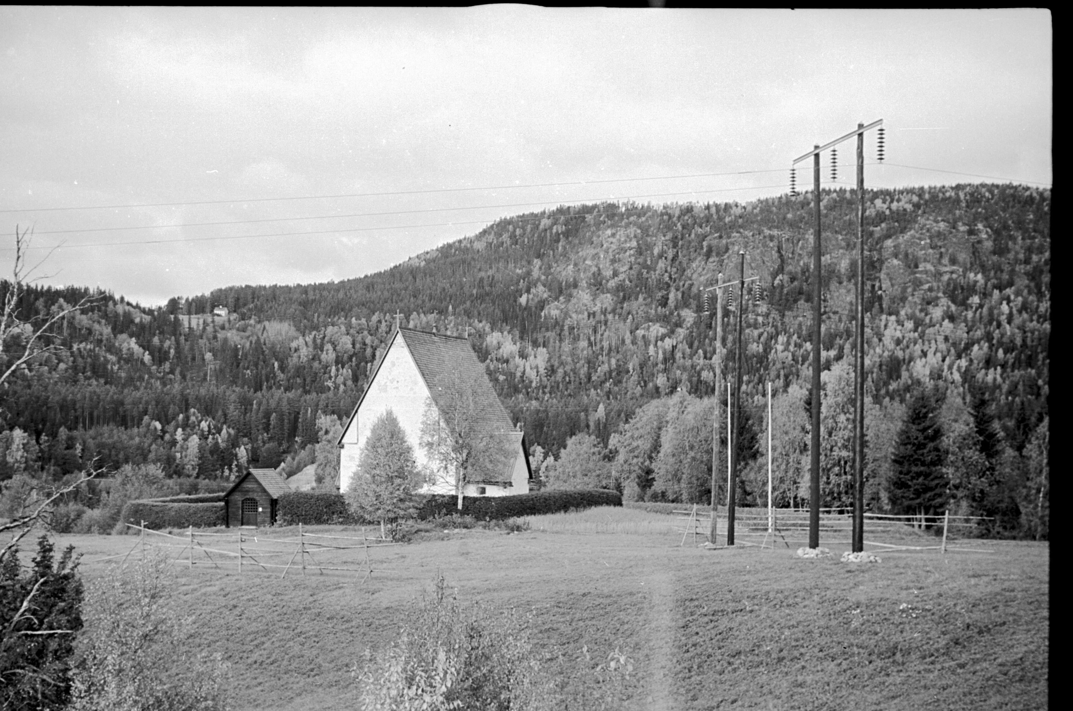Kyrkan från nordöst. Bilden avser att illustrera kraftledningens läge i förhållande till kyrkan.