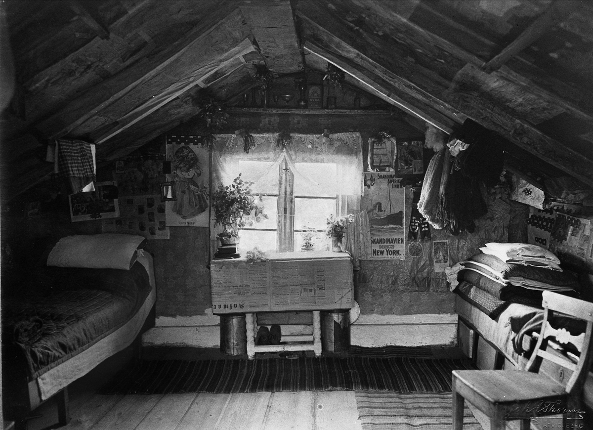 Interiör från backstuga vid Linnabacken, Torsås, Småland. Affisch för Skandinaviska Amerikalinjen på väggen.