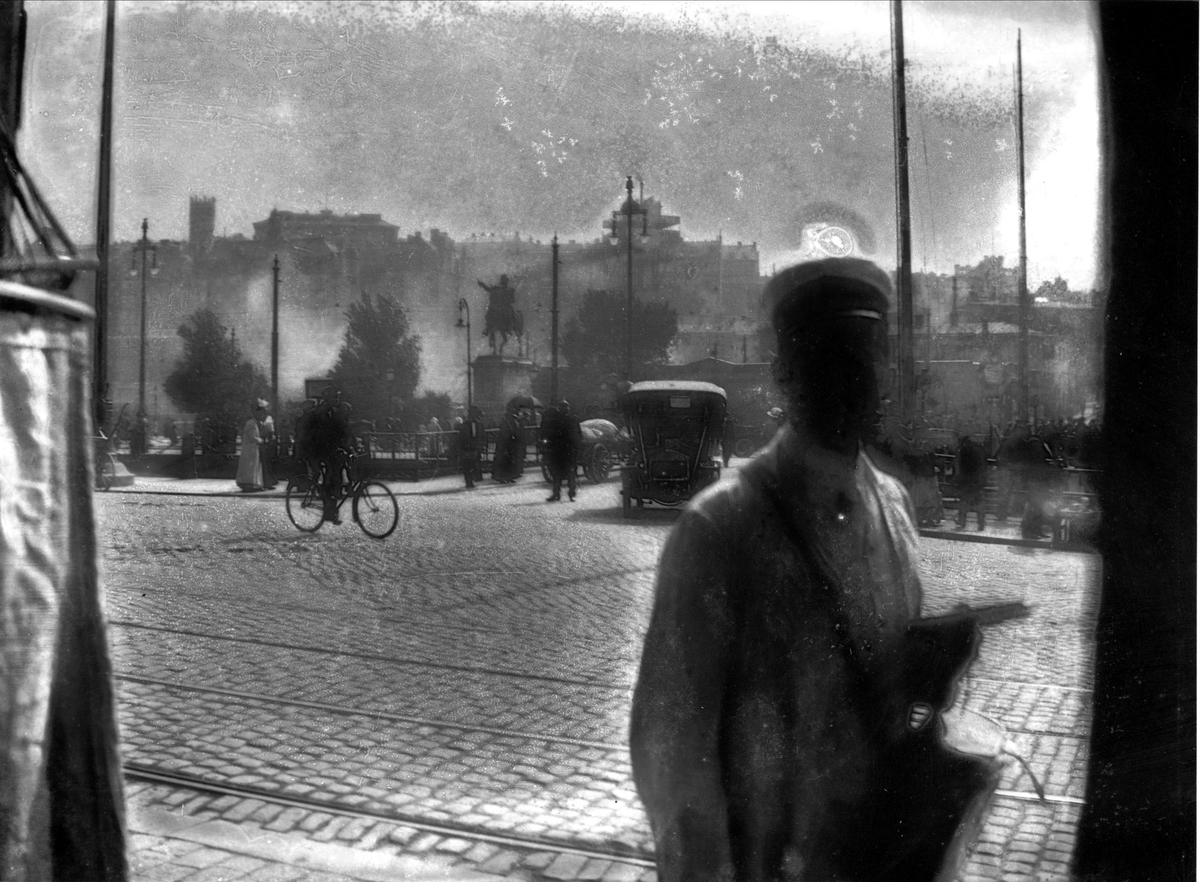 Stockholm. Slussen vid Karl Johans torg mot söder. Uniformerad man (brevbärare?) i motljus i förgrunden.