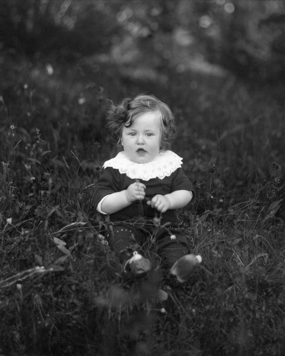 "Per Eriksson, Östra Ärnäs, Lima socken, Dalarna." En liten pojke sitter i gräset.