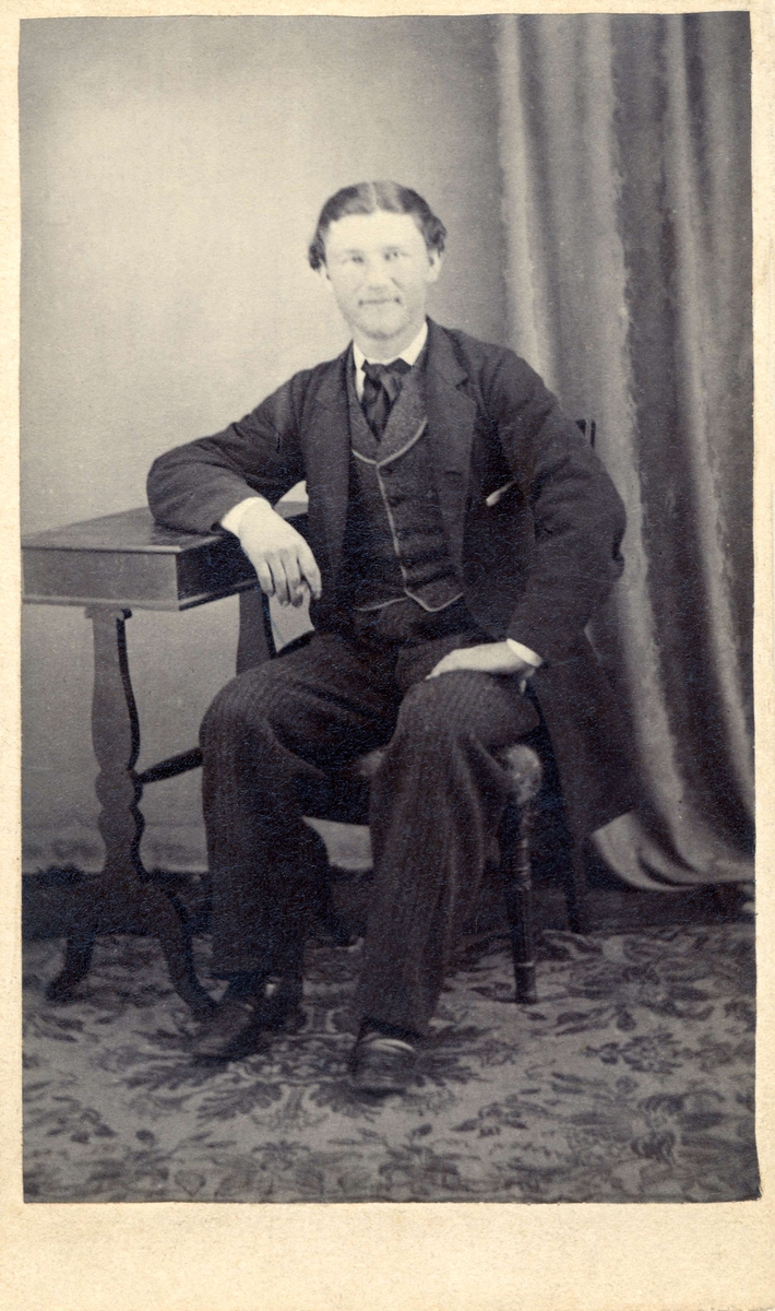 Man sittande på en stol poserar för fotografen. Från Skåne. Inv.nr. 18539C.