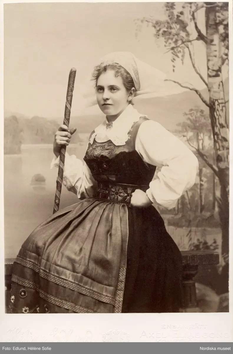 Porträttfoto på en kvinna i folkdräkt från Södermanland.