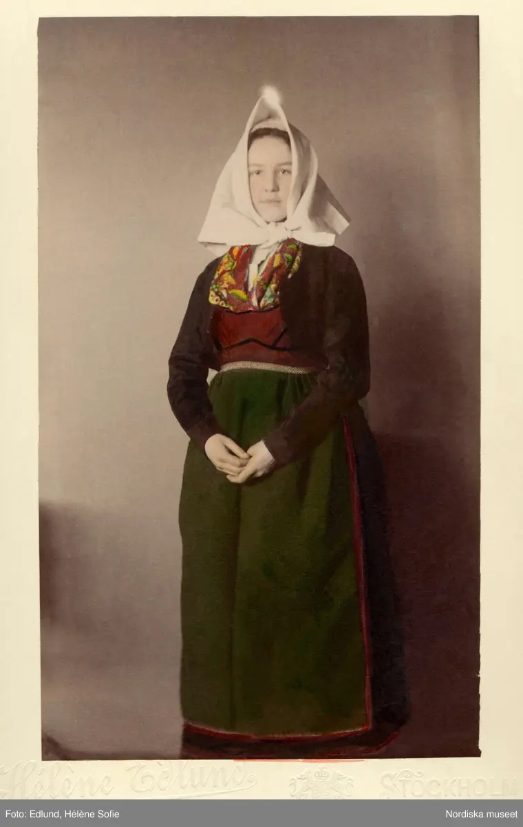 Porträtt av ung kvinna iklädd folkdräkt: svart vadmalsdräkt, grönt förkläde med röda kanter, brokig halsduk, röd kant nederst på kjolen