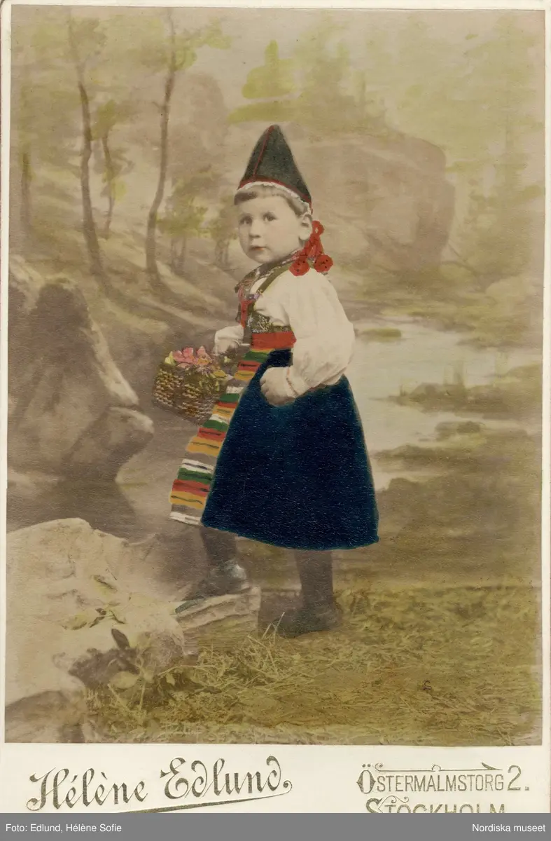 Liten flicka i folkdräkt med en blomsterkorg på armen