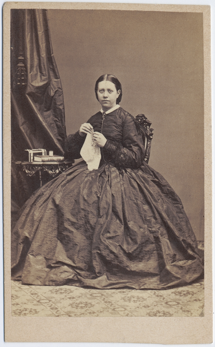 Kabinettkort. Porträtt, helfigur, av kvinna. Hon är iklädd mörk klänning med vid kjol, vida ärmar och liten vit krage. Hon sitter vid ett litet pelarbord och håller ett broderi i händerna. Dräktbilder dam. 1860-tal.